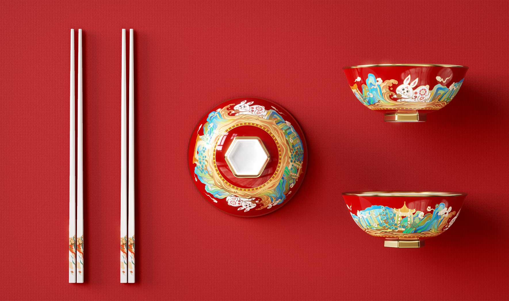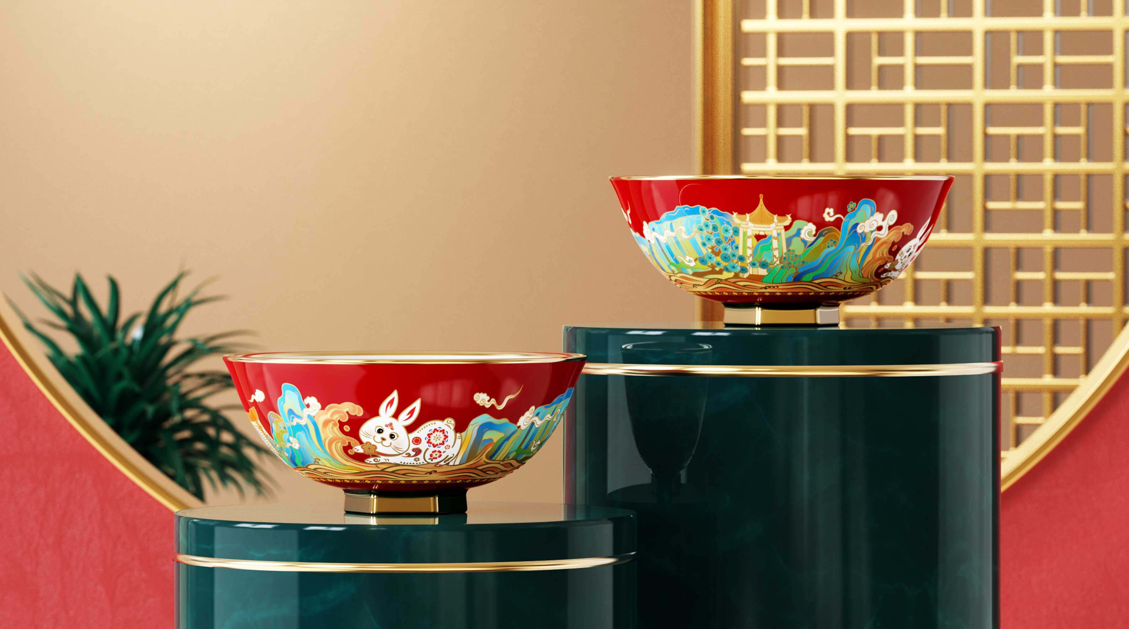 吉祥的玉免視覺(jué)手執(zhí)新春梅花傳承非遺剪紙技藝,傳遞新春的喜悅與祝福,赤水河環(huán)繞在碗底,寓意福水長(zhǎng)流楊柳灣古井、茅臺(tái)正大門青綠山水之間,躍然于碗邊傳遞著深厚的茅臺(tái)文化,圓碗方底,方圓結(jié)合,更顯古韻。