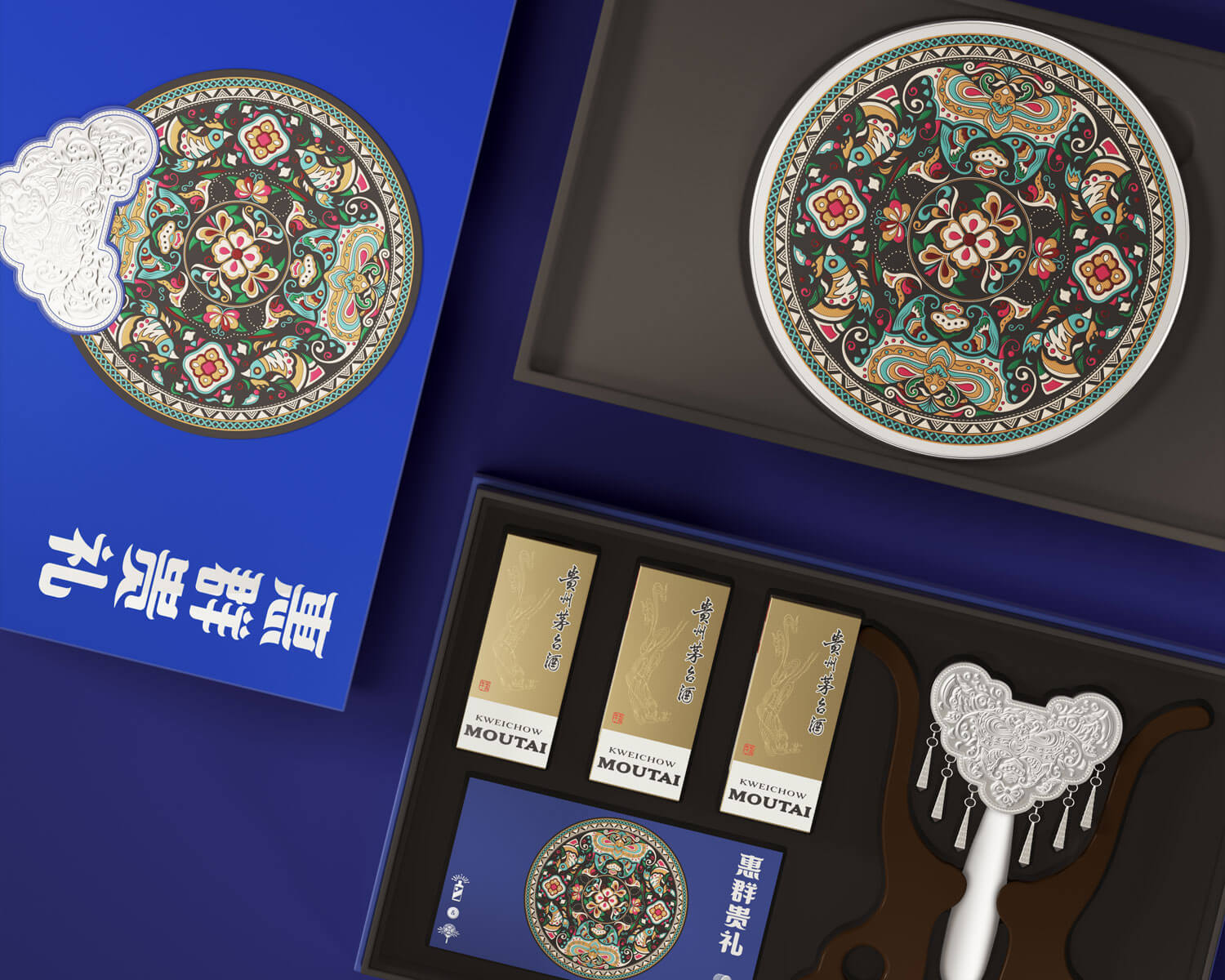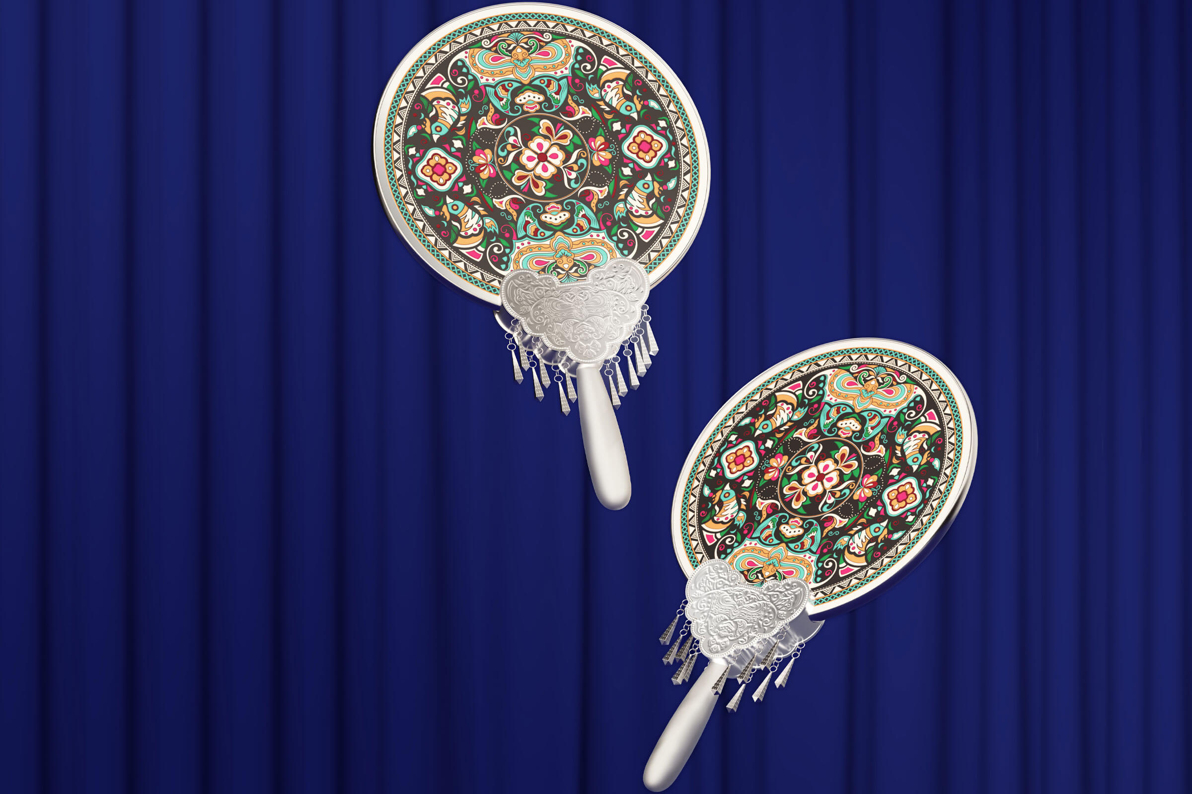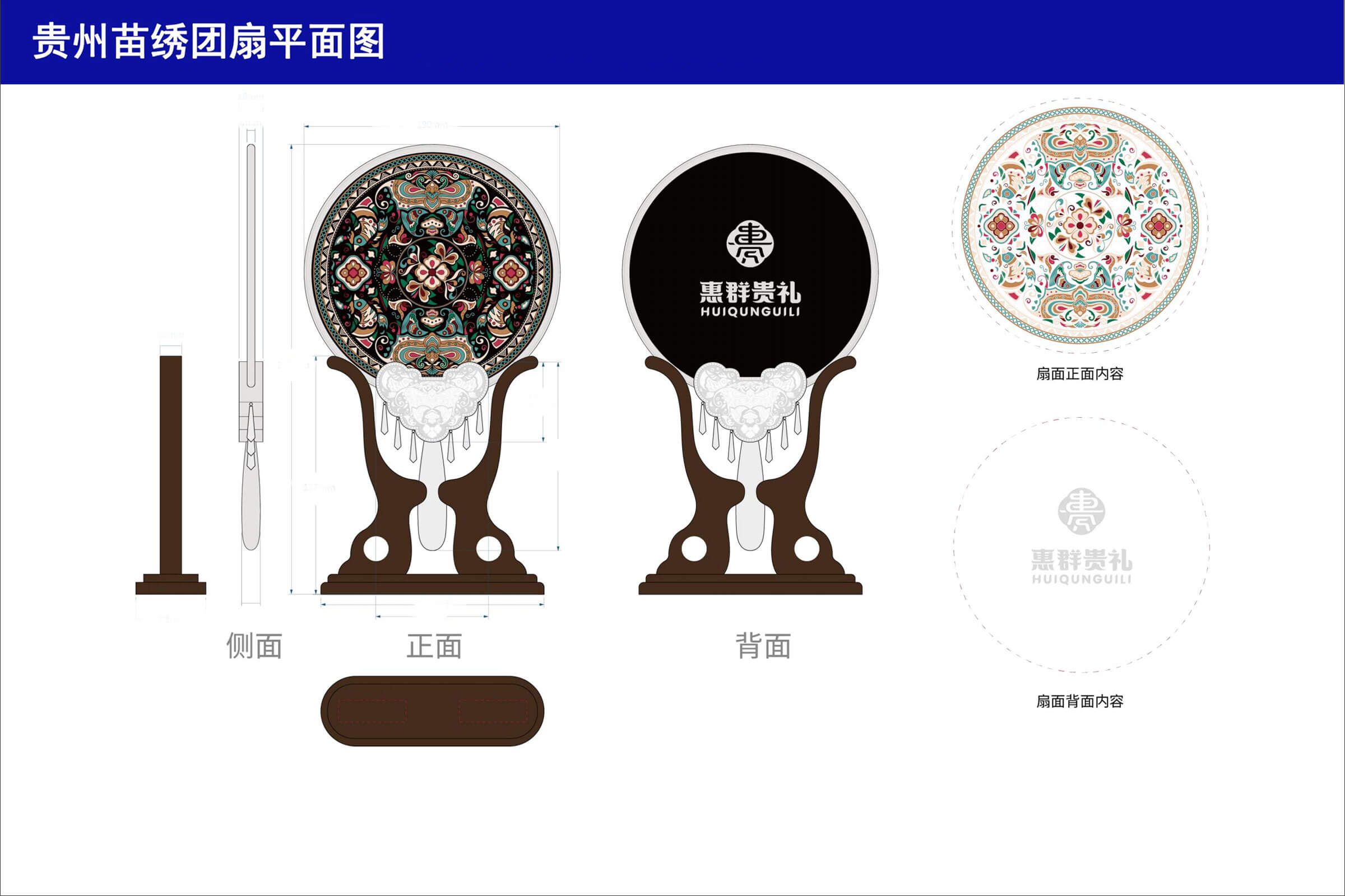 貴州苗繡是中國(guó)苗族民間傳承的刺繡技藝,也是苗族歷史文化中特有的表現(xiàn)形式之一,在苗繡圖案方面,最典型的當(dāng)屬蝴蝶紋樣同時(shí)非常講究對(duì)稱美。為此在團(tuán)扇配品設(shè)計(jì)創(chuàng)作中,我們以中式對(duì)稱美學(xué)出發(fā),以苗繡蝴蝶紋樣為主視覺,呈現(xiàn)一個(gè)古典、和諧的苗繡團(tuán)扇。