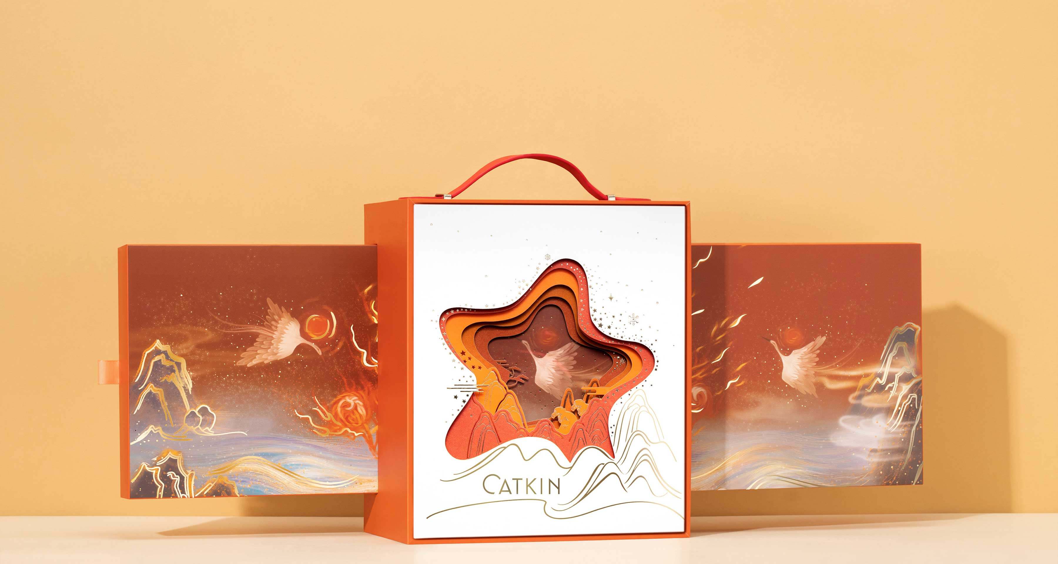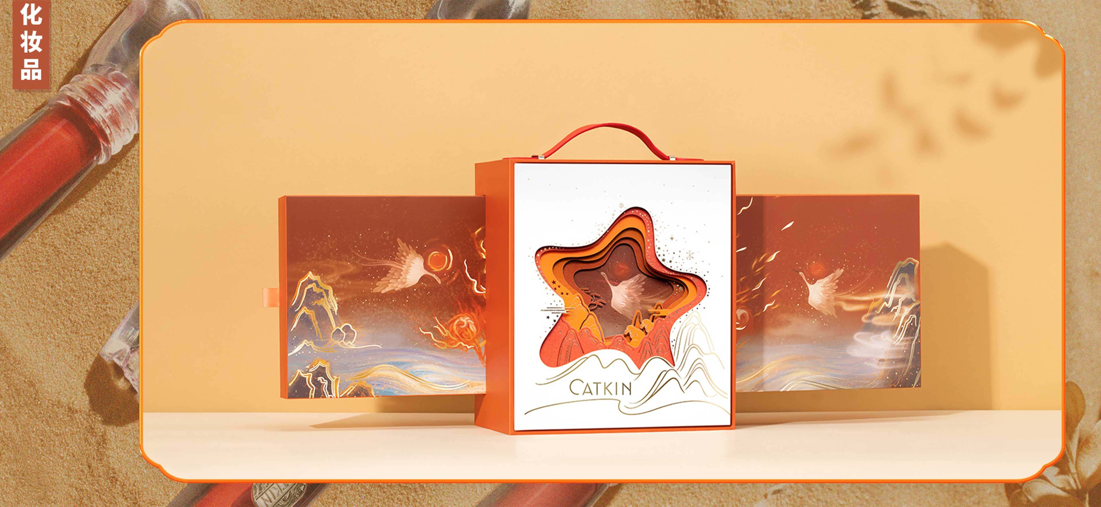 盒插畫靈感來自于《海經(jīng)·海外東經(jīng)》中的“湯谷上有扶桑,十日所浴,在黑齒北。居水中,有大木,九日居下枝,一日居上枝,并將其繪制成內(nèi)盒包裝插畫進行展示,通過手提箱造型融入禮盒,輔以皮質(zhì)提手疊加燙金線條嵌之立體紙雕,質(zhì)感輕奢妝奩輕啟,盡收綺麗山海之美,蘊情于禮,只為伊人。