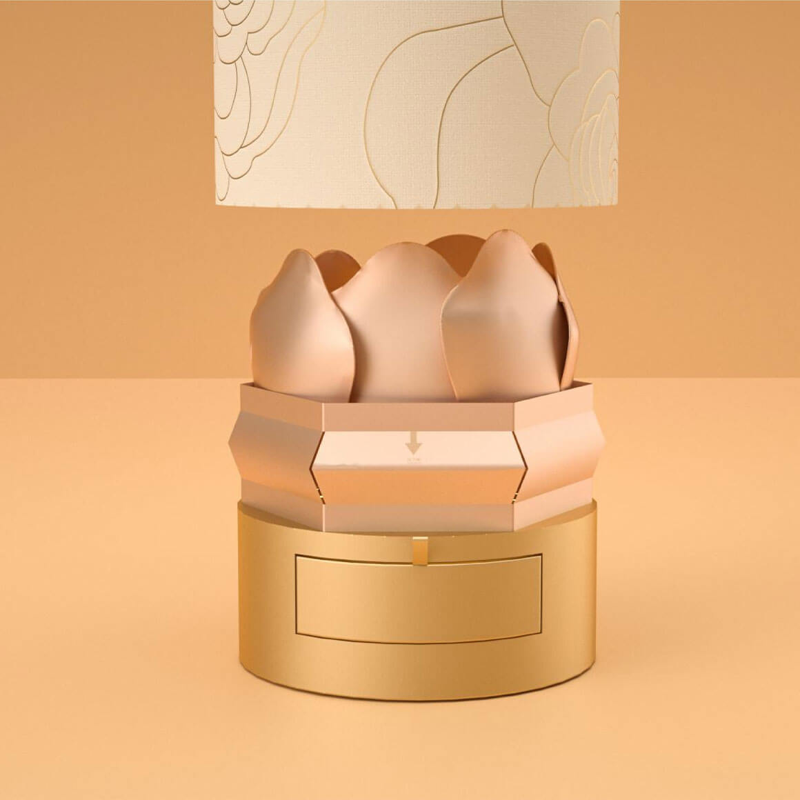 圓筒盒型上的簡(jiǎn)約線條玫瑰花元素象征著綻放的美麗,當(dāng)提出外殼時(shí),如同一朵綻放的玫瑰,展現(xiàn)出產(chǎn)品的力量和女性的自信。底座的抽拉式設(shè)計(jì)搭配這仿佛慢慢綻放的花蕾,寓意著潔然而生,美麗綻放的每一位女性。這種設(shè)計(jì)不僅是包裝,更是對(duì)女性力量和美麗的致敬,讓每位使用者在打開禮盒的一瞬間,感受到自己即將綻放的美麗。