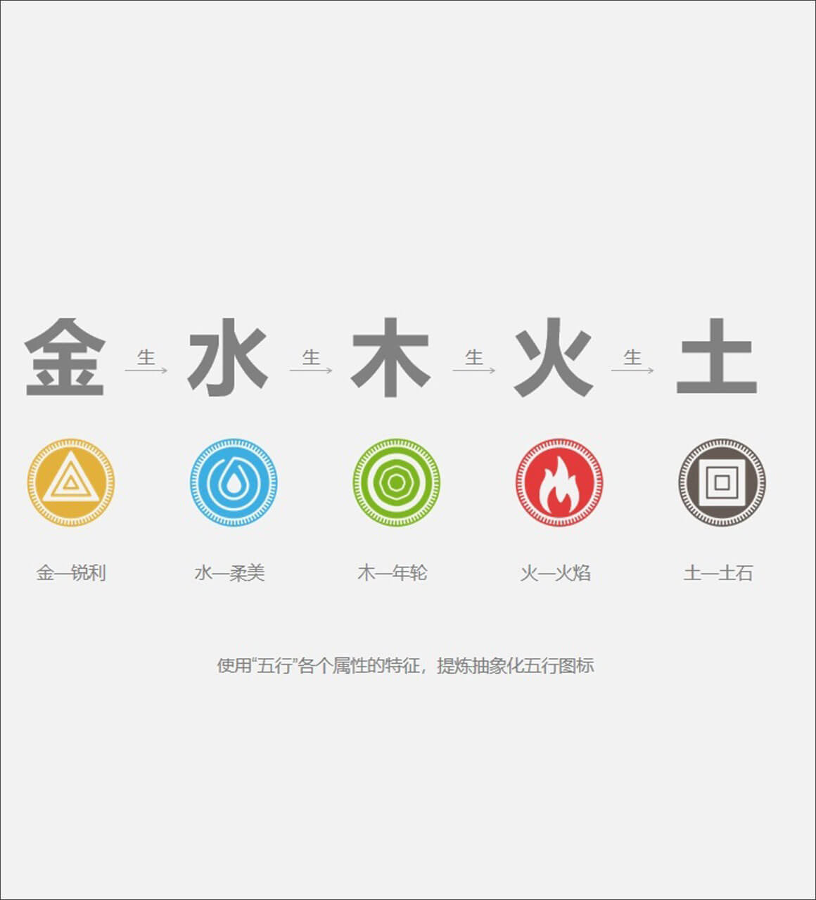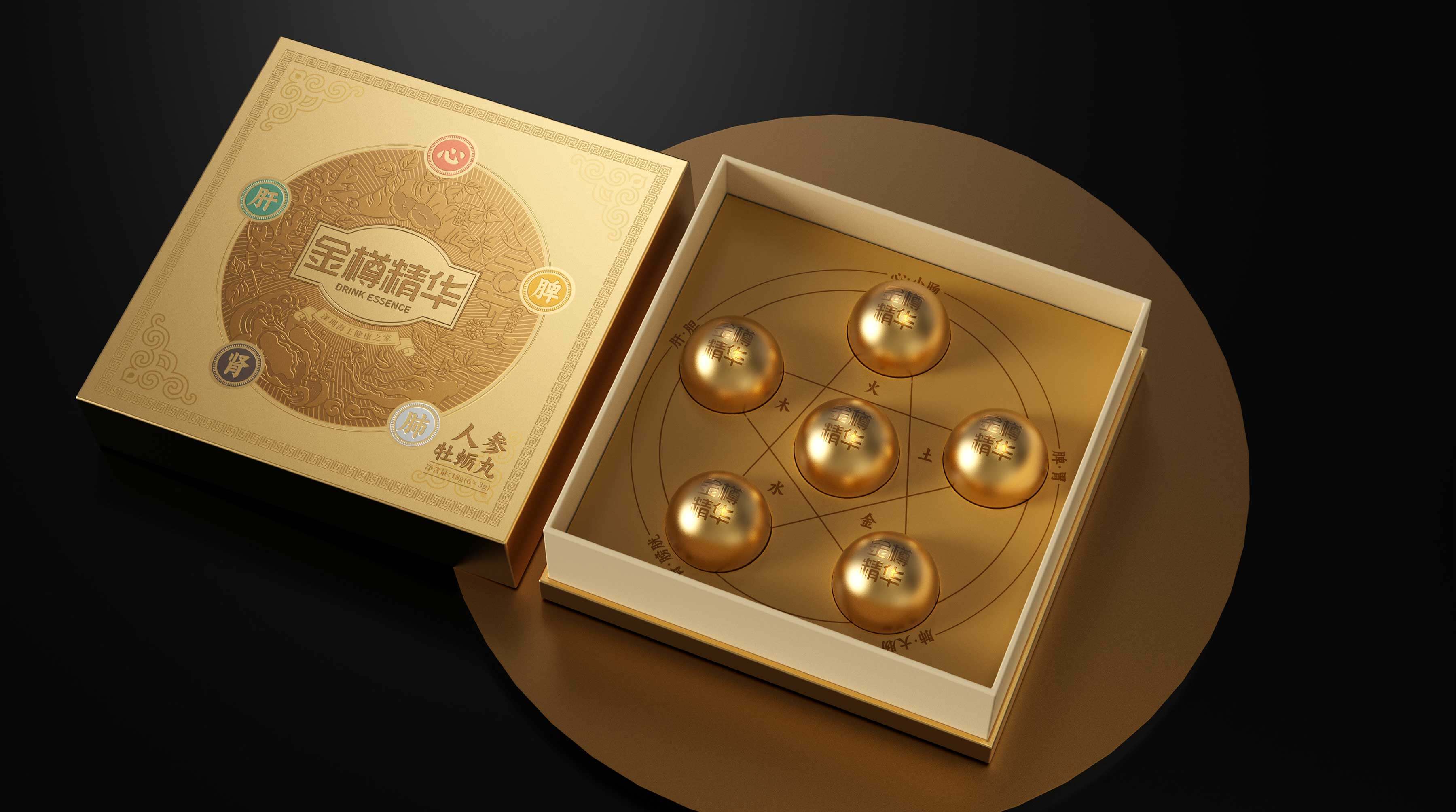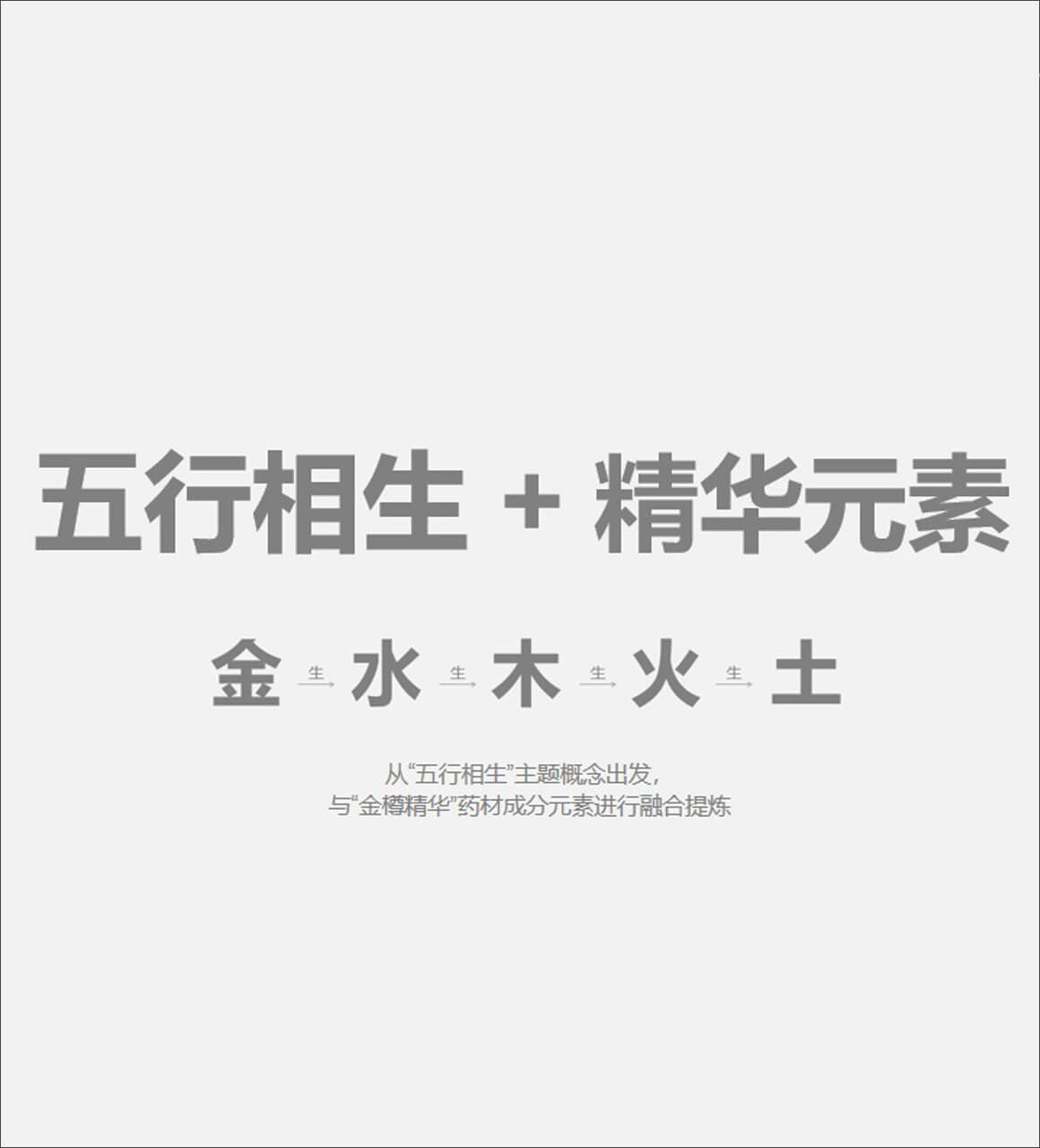 將“金樽精華”的藥材成分元素提煉與“五行”圖案融合,各藥材位置與五行對(duì)應(yīng)五臟的方位與相對(duì)應(yīng)。